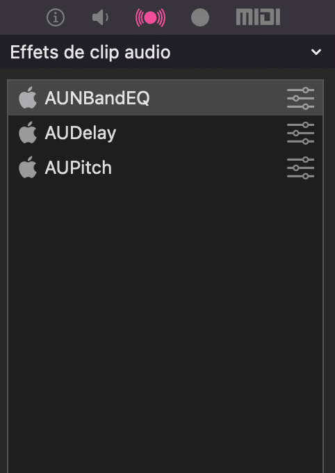 SparkFX prend entièrement en charge les plug-ins d’effets Audio Unit. Votre Mac est livré avec de nombreux effets intégrés dont vous pouvez profiter. Les plug-ins d’effets tiers sont également pris en charge.