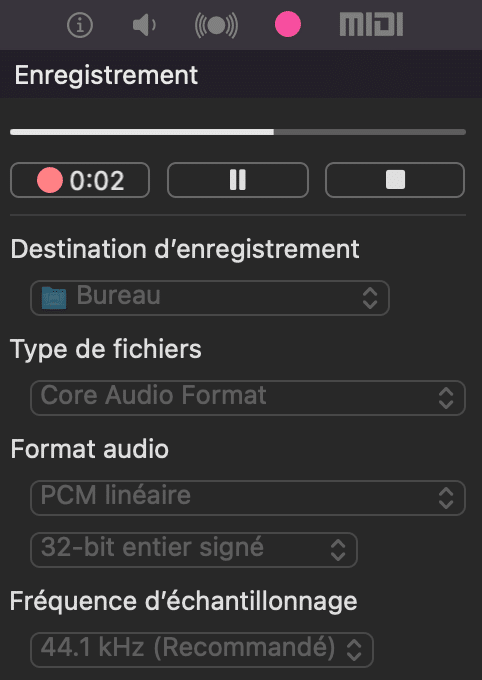 Grâce à l’enregistrement intégré, vous n’avez plus besoin d’une autre application pour enregistrer vos sessions en direct dans un fichier audio. Il suffit de choisir une destination et un format de fichiers, puis d’appuyer sur Enregistrer.