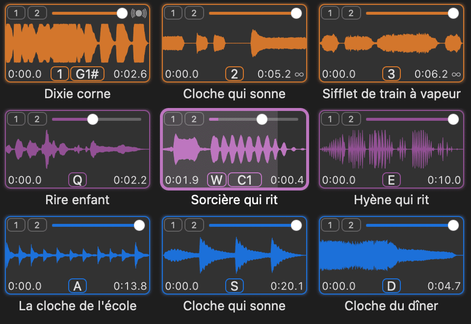 Chaque clip sonore peut réagir différemment lorsque vous appuyez sur une touche ou que vous la relâchez. Vous pouvez marquer une pause en relâchant une touche et reprendre en appuyant sur la touche. Vous pouvez même recommencer la lecture en appuyant sur une touche.